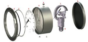 – Cơ cấu chuyển động: Bên trong đồng hồ có cơ cấu chuyển động bao gồm các bánh răng và lò xo. Chuyển đổi áp suất từ môi trường đo sang chuyển động của kim đồng hồ.